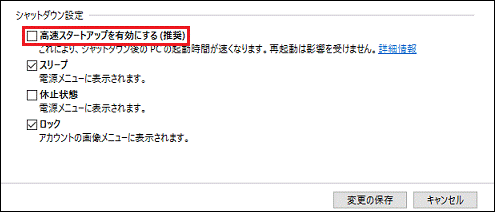 5、「高速スタートアップを有効にする(推奨)」のボックスからチェックを外して「変更の保存を」クリックします。