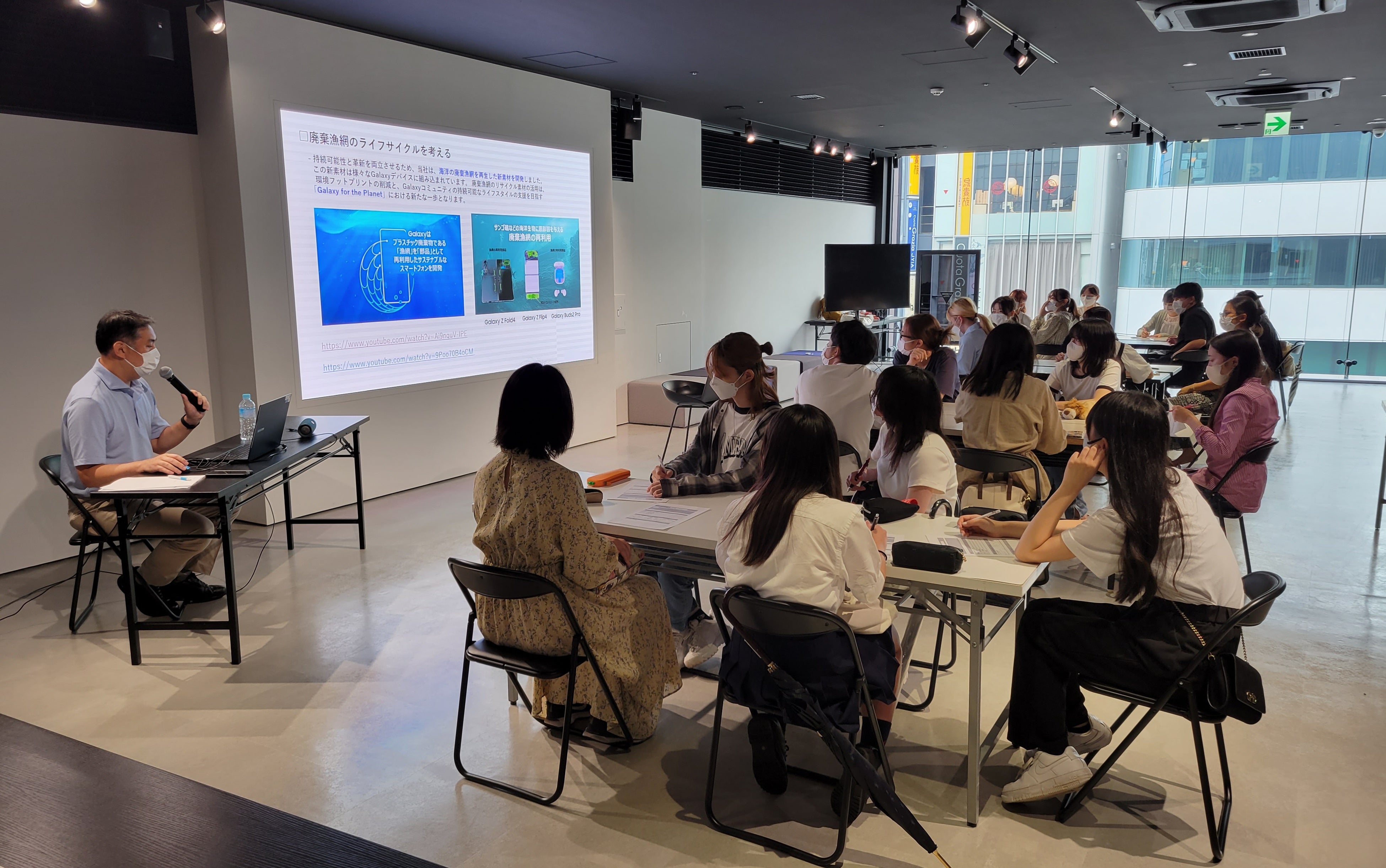 本会議では、GalaxyのSDGsへの取り組みの一つである「廃棄漁網を再利用したスマートフォン」について、自分がGalaxyのPR責任者であった場合「どうしたらもっと多くの人に知ってもらえるか」「どうしたら購入してもらえるか」を議題とし、高校生31名がディスカッションを実施。高校生がスマートフォンとSDGs課題について、どうすればZ世代の若者が身近に考えることができるかを話し合いました。