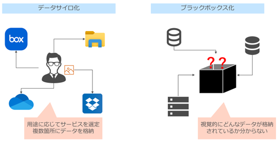 特にデータのサイロ化については、各データがOneDriveやBOXといった複数のサービスに蓄積されており、検査で必要となるデータがどこに格納されているかが視覚的にわからない、ブラックボックス化が起きていました。