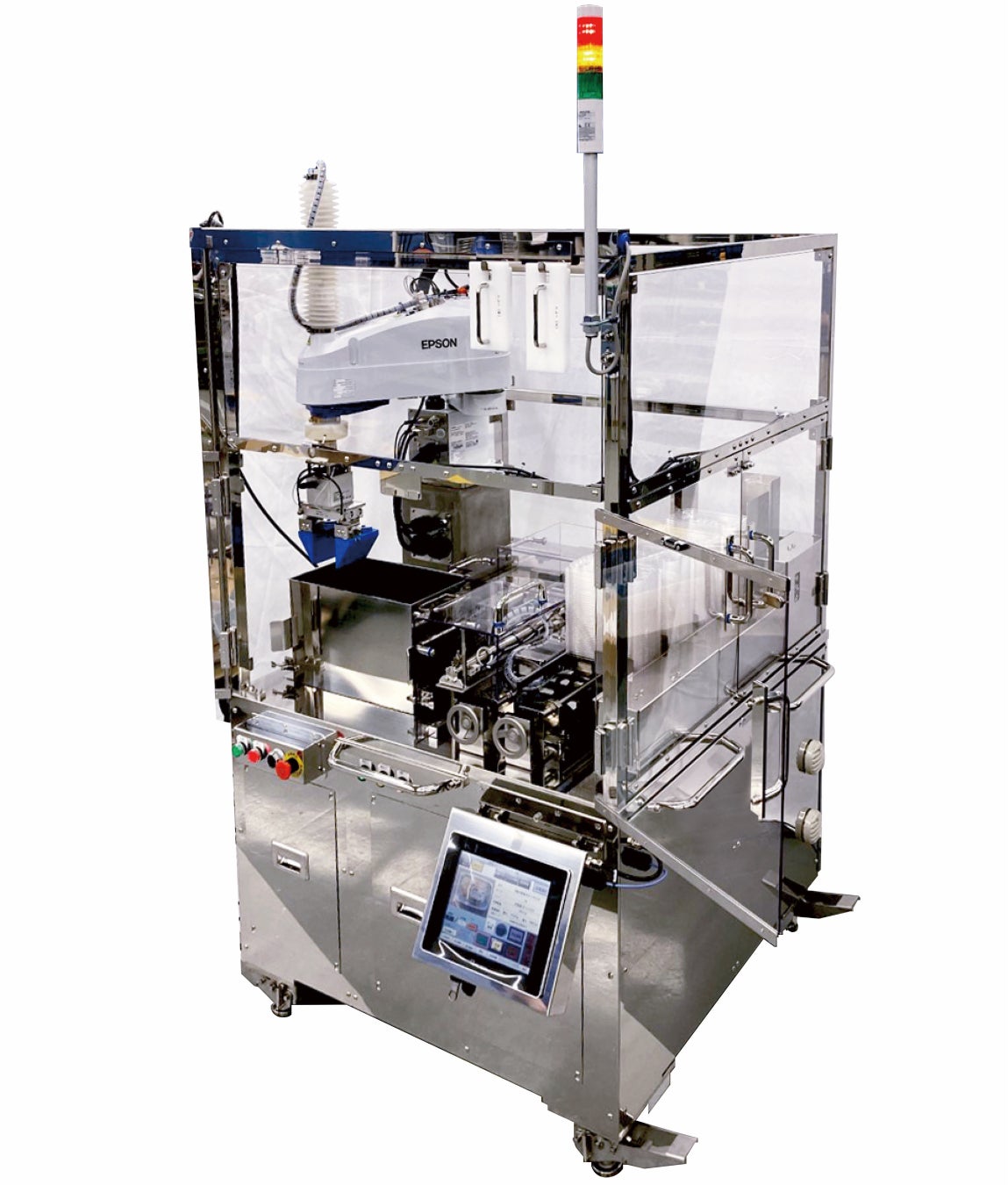 Delibot™は不定形の食材を一定量測ってトレイに盛り付けます。省スペースでの設計技術を活かして人と協働し、段取り替えが多い惣菜の盛付工程の省人化や自動化を行うことができます。
