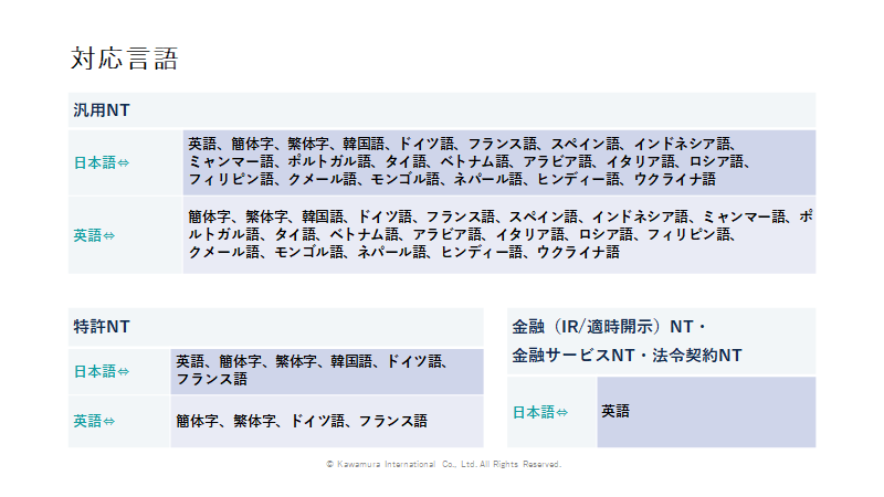 利用可能な翻訳エンジン:汎用 / 特許 /金融(IR/適時開示)/金融サービス /法令契約 の全エンジン