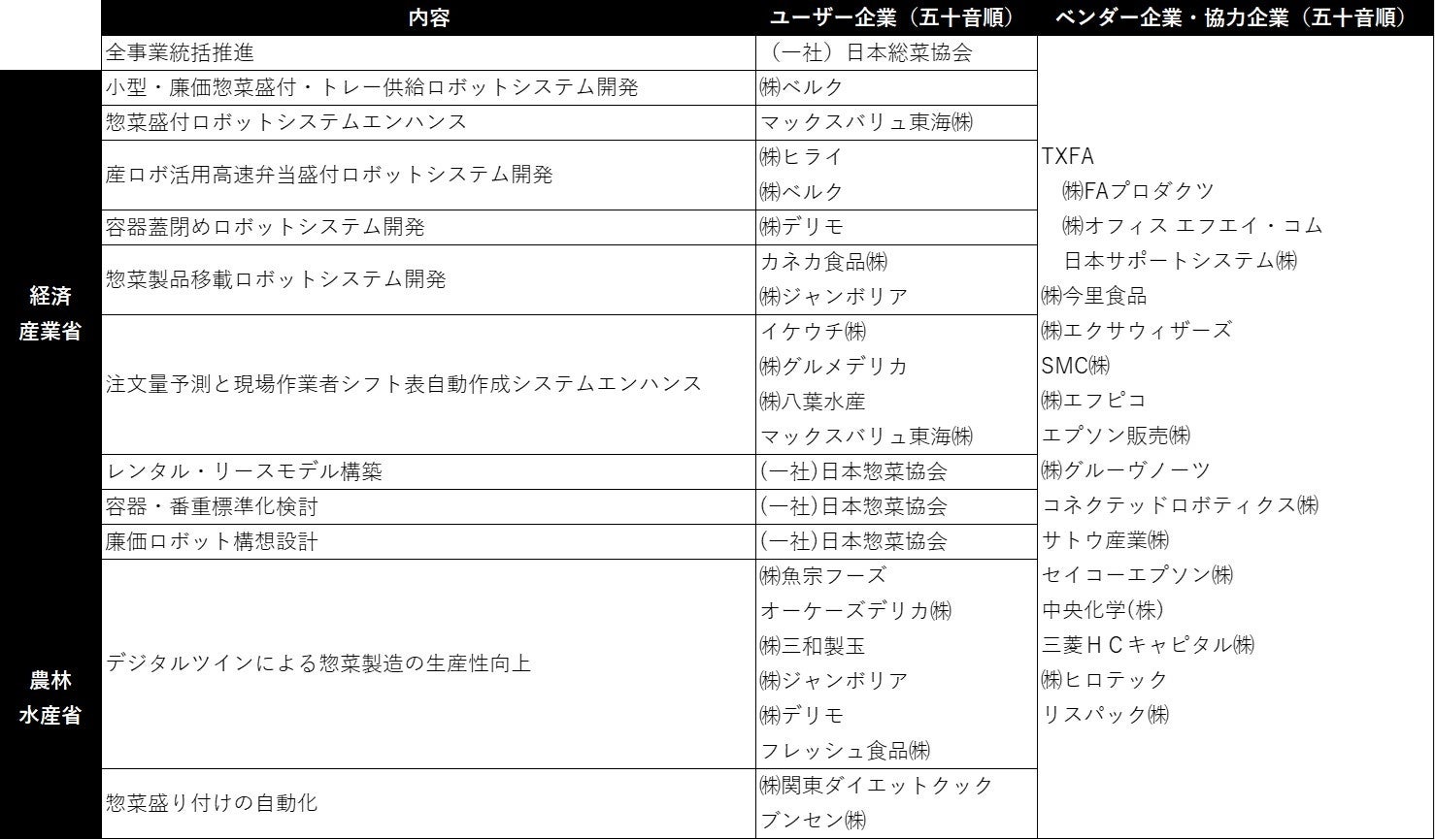 これらの課題を解決するため、惣菜製造で最も人手のかかる惣菜盛り付け作業など、全惣菜製造企業が共通して困っている課題に対して、多くの企業がバラバラに重複した開発を行うのではなく、共通課題解決に必要な機能を実現するための要素技術において、トップクラスの技術を持つ企業が集まって解決します。更に、技術の合本だけでなく、ユーザーの資本の合本により、開発費や設計費を折半し、一企業が負担する開発費の低減を実現します。