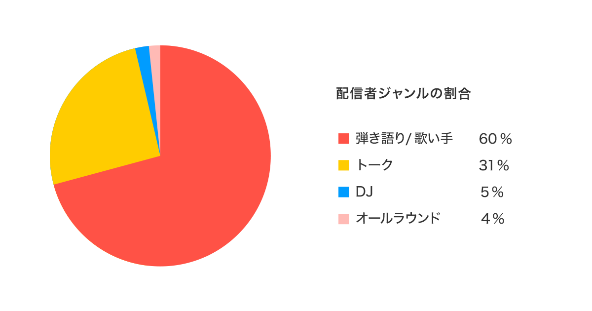 配信者の中には、歌唱を得意とする配信者やトークを得意とする配信者などジャンルもさまざまですが、AWAの公認配信者では弾き語り/歌い手が6割を占めています。これは、AWAが音楽サービスとして音声ライブ配信機能を提供している側面や、機能解放後のキャンペーンが歌唱を伴うものが多い傾向にあった為と考えています。しかしながら、8月に開催したラジオ出演キャンペーンや、CMのナレーション出演権など、声を主体とした内容のキャンペーンも開催されたため、トーク系の配信者も最近増加傾向にあります。その他にも朗読をする人やDJなどジャンルはさまざまです。