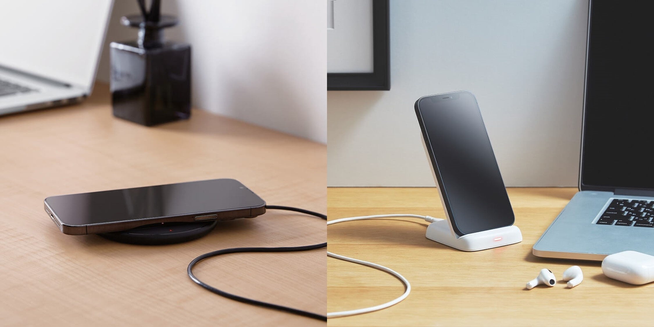 Qi規格準拠のワイヤレス充電器に、より急速な充電を可能にするEPP規格対応の新モデルが登場します。EPP規格15Wまで対応の卓上タイプと、EPP規格10Wまで対応のスタンドタイプの2タイプをご用意しています。従来のBPP規格にも対応し、iPhoneをはじめGalaxy/Pixel/XperiaなどのAndroid端末、AirPodsなど幅広い機種で使用可能です(※1)。
