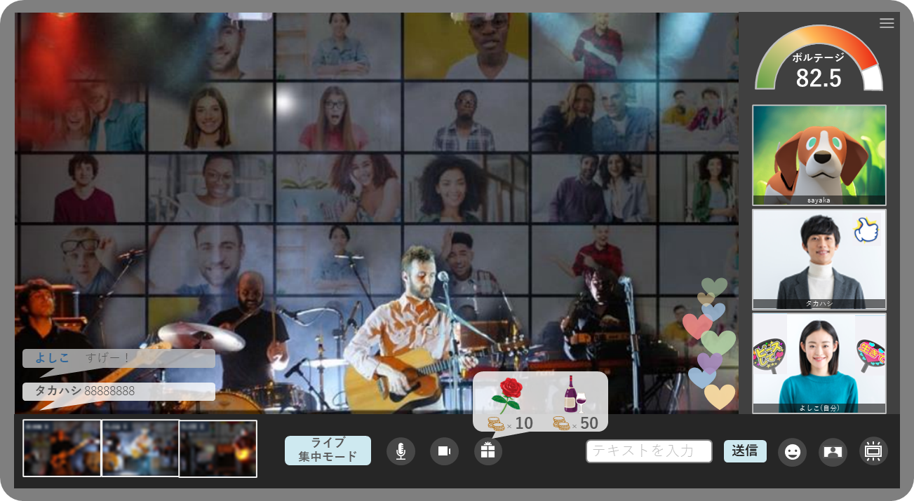 ・ファンウォール機能:視聴者映像を一斉表示し、現地のアーティスト等とコミュニケーション