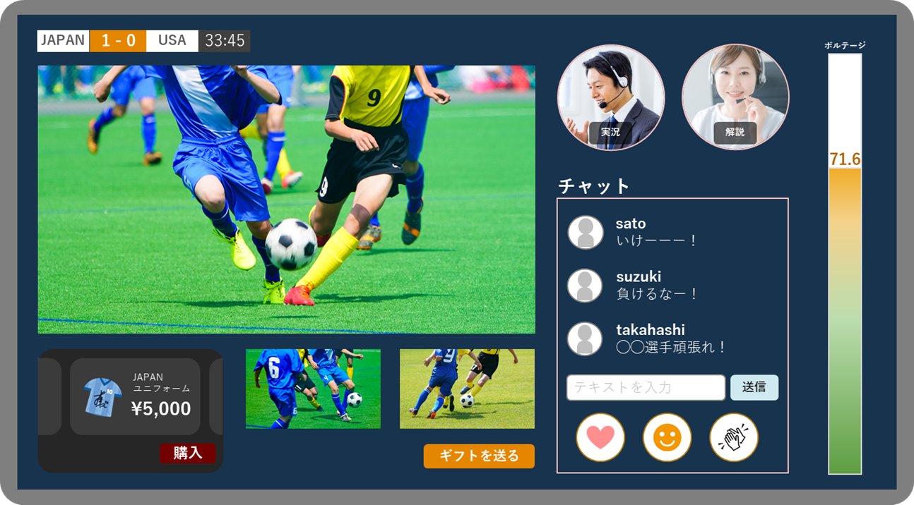 ・ウォッチパーティ機能:遠隔の友人等と会話しながら、ライブ映像を共同視聴