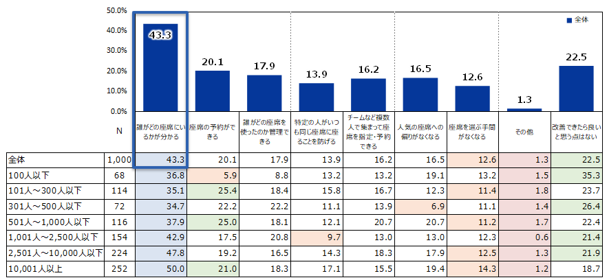 企業規模を問わず「誰がどの座席にいるかが分かる」という改善要望が43.3%と、他の改善要望を大きく上回っています。その他の改善要望は、「座席予約ができる」「誰がどの座席を使ったのか管理できる」と続いています。