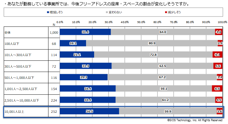 企業規模を問わず半数以上の回答が「変わらない」であったものの、「増加しそう」が平均値31.4%と、3割強の企業が増加を検討していることがうかがえます。「増加しそう」と回答した企業の傾向としては、「10,001人以上」では36.5%、「2,501人以上~10,000人以下」では34.4%と、規模が大きいほどフリーアドレスのニーズが高いことがうかがえます。