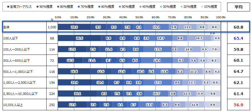 オフィスにおけるフリーアドレスの座席割合の平均値は60.8%と、固定席よりもフリーアドレスの席が多く設けられています。「全席フリーアドレス」に着目すると、「100人以下」が26.5%で最も高く、次いで「2,501人~10,000人以下」は24.1%、「1,001人~2,500人以下」は20.8%と続きます。