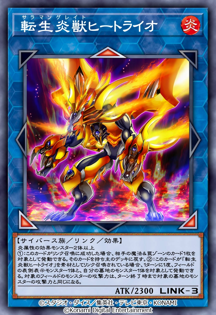 さらに、自身が「転生炎獣ヒートライオ」を素材としてリンク召喚されている場合、1ターンに1度、フィールドの表側表示のモンスターの攻撃力を、ターン終了時まで自分の墓地のモンスター1体の攻撃力と同じにする事ができるのだ!