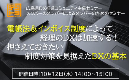 OBCは広島県DX推進コミュニティのメンバーの一員として、次のとおり、改正電子帳簿保存法とインボイス制度に関するセミナーを企画・実施し、メンバーのDXを支援致します。