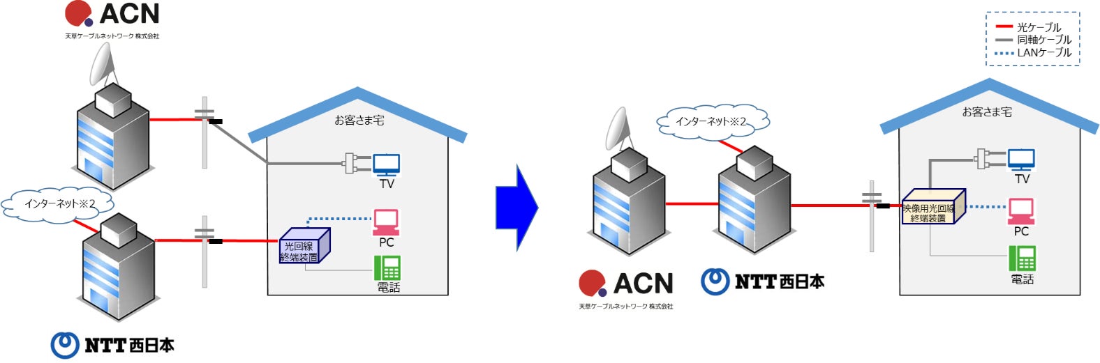 ACNは、上記記載エリアにおけるNTT西日本のフレッツ光提供エリア内のACNの既存同軸ネットワークについて、今後数年以内にご希望される全てのお客さまをNTT西日本の光アクセスサービスへ移行※5できる環境構築をめざします。なお、既存のインターネットサービスをご利用のお客さまだけでなくテレビのみサービスをご利用のお客さまも、NTT西日本の光アクセスサービスを通じて既存のテレビのみサービスを継続してご利用できることは全国初の取組み※6であり、地域の皆さまの快適で先進的な映像・通信総合サービスの実現を推進してまいります。