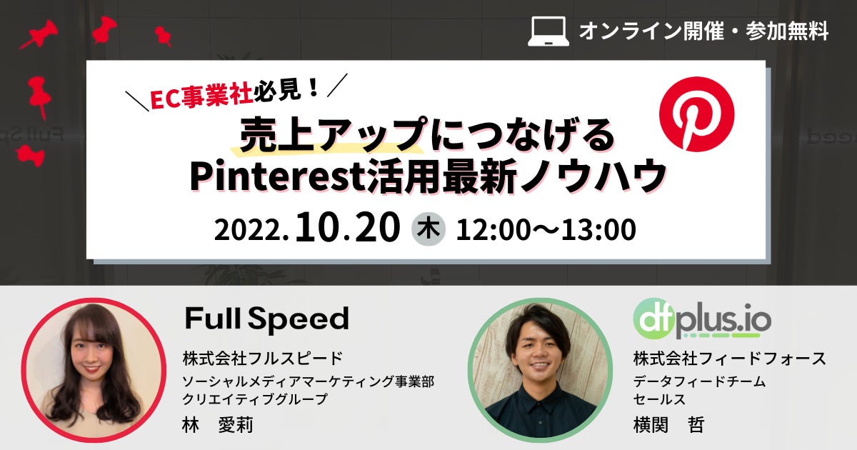 本セミナーでは、SNSの最前線でマーケティング活動を支援している当社と、SNSをはじめとするデータフィード事業を幅広く支援している株式会社フィードフォースの2社共催で、Pinterestに関するマーケティングの運用ノウハウと最新トレンドや、事例についてご紹介します。