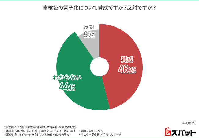 ・車検証の電子化について、46.2%の人が「賛成」と回答した一方、「わからない」と回答した人が44.1%に上った。