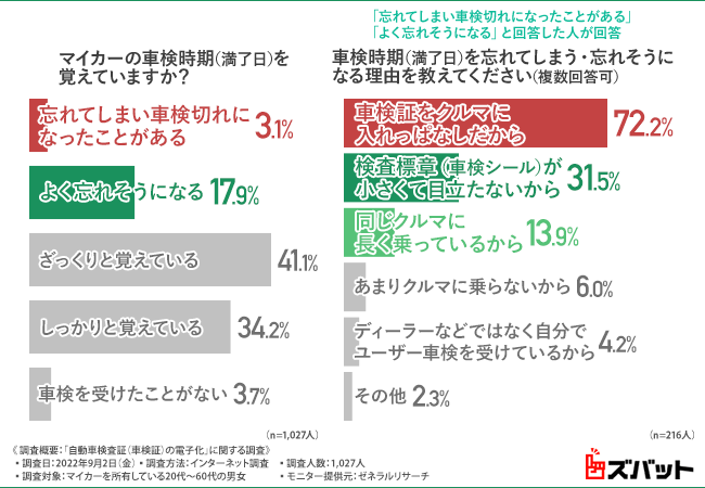 ・マイカーの車検時期について覚えているか質問したところ、21.0%の人が「忘れてしまい車検切れになったことがある(3.1%)」「よく忘れそうになる(17.9%)」と回答。その理由は「車検証をクルマに入れっぱなしだから(72.2%)」が最多。