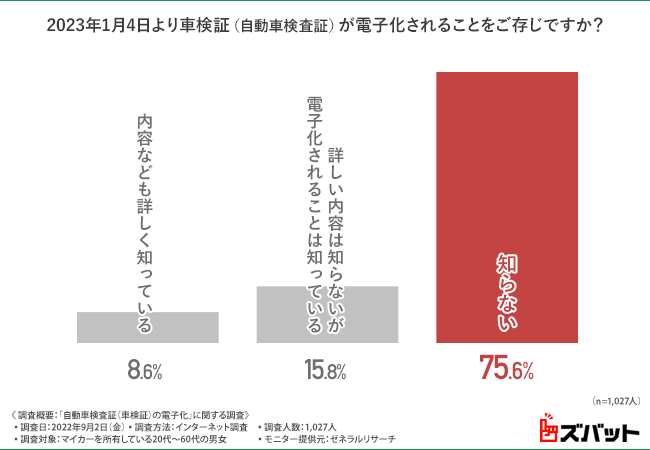 ・アンケート回答者1,027人のうち、75.6%の人が「2023年1月4日より車検証が電子化されることを知らない」と回答。車検証の電子化はマイカーオーナーに浸透していない実態が浮き彫りに。