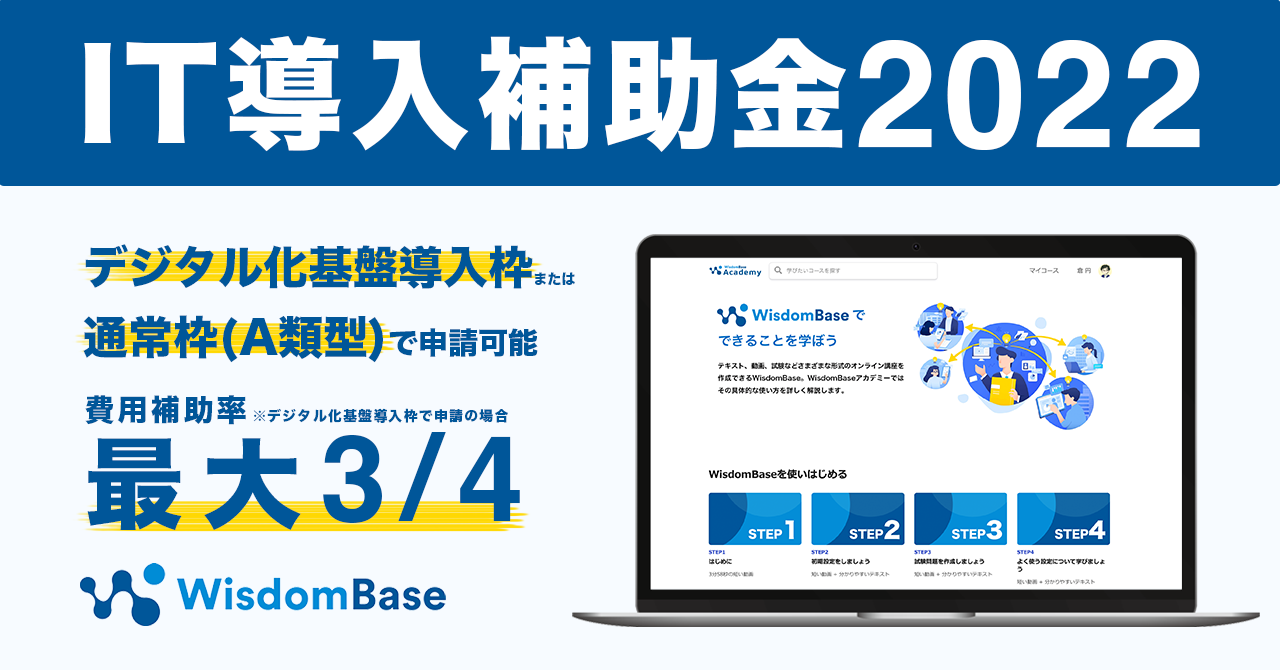 拡張エンタープライズ学習管理システム (EE-LMS) WisdomBase(ウィズダムベース)を運営する株式会社シェアウィズ(本社: 大阪府大阪市、代表取締役 辻川 友紀、以下シェアウィズ)は、この度、令和元年度補正・令和3年度補正サービス等生産性向上IT導入支援事業費補助金におけるIT導入支援事業者として採択されたことをお知らせいたします。