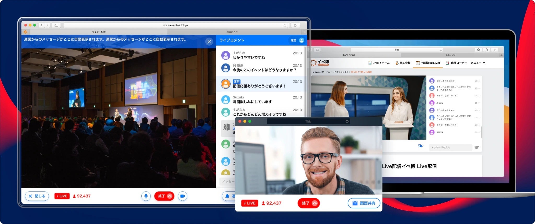 リアル・オンライン・ハイブリッドイベントをWEBとアプリでサポートする機能が充実しております。