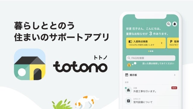 住まいのサポートアプリ「totono」は、賃貸物件にお住いの入居者と物件の管理会社を繋ぐスマートフォンアプリケーションです。これまで入居者と管理会社とのやりとりは電話や書類手続といった手段が中心となっていましたが、「totono」により管理会社への問い合わせや各種申請、契約内容の確認をアプリ内で行えます。