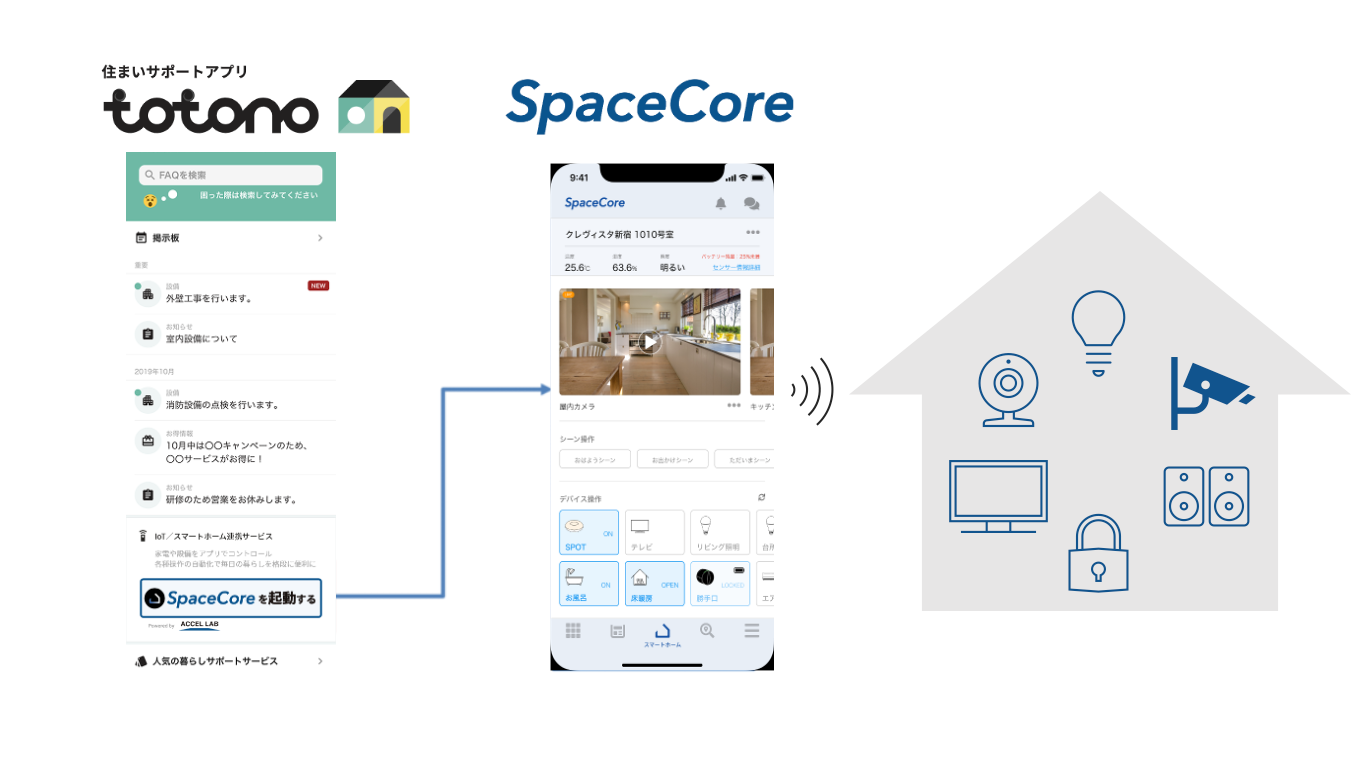 この度の連携で入居者は「totono」内で「SpaceCore」のスマートホームが利用できるようになり、賃貸物件に関する契約・問い合わせに加え、家電・設備・スマートホーム機器の操作も「totono」アプリから利用できるようになります。また、管理会社は、「totono」で管理している物件情報や入居者情報が「SpaceCore」に連携されるため、入退去に伴う新規入居者への権限付与や退去者の権限削除といった一連の業務も「totono」上で統括的に行うことができ、スマートホーム導入における業務工数の削減と物件の価値向上を実現することができます。