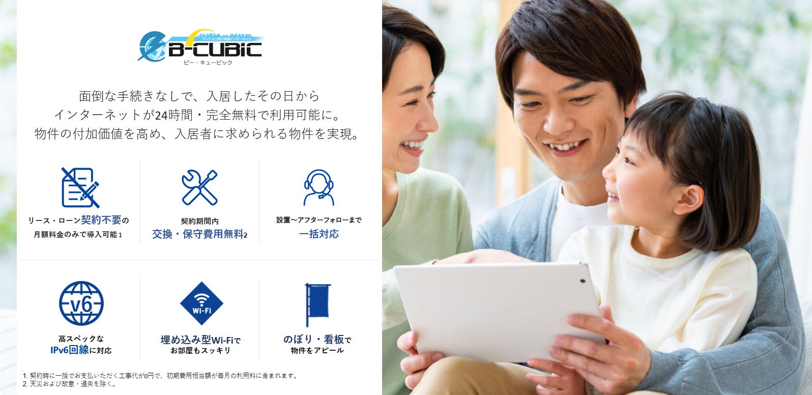 集合住宅に全戸一括で入居者が無料でインターネット接続できるサービスです。大手通信事業者のインターネットサービスは、利用を希望する入居者からの個別の申し込みと個別の導入工事が必要であり、各入居者には初期工事費用や毎月の利用料の負担が発生しますが、「B-CUBIC」は、入居者からの申し込みは不要、かつ無料でインターネットの利用が可能となります。