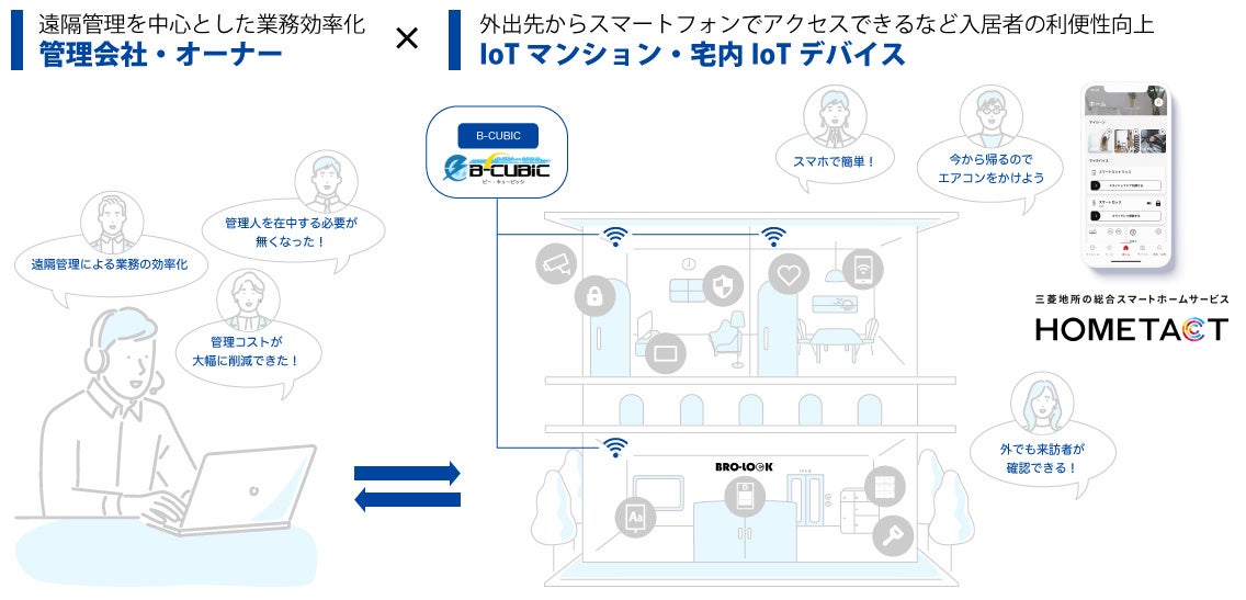 ブロードエンタープライズが提供するマンション向け高速インターネット「B-CUBIC」と三菱地所が開発した総合スマートホームサービス「HOMETACT(ホームタクト)」を軸にしたIoTサービスの販売パッケージの構築に着手します。主に賃貸の集合住宅において、共用部・専有部共にIoT化することによる物件のバリューアップ・入居者の満足度向上と、不動産管理におけるDX化による業務効率化を実現していきます。