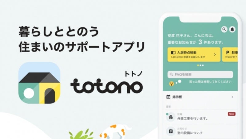 住まいのサポートアプリ「totono」は、賃貸物件にお住いの⼊居者と物件の管理会社を繋ぐスマートフォンアプリケーションです。⼊居者はこれまで管理会社とのやりとりは電話や書類⼿続といった⼿段に限られていましたが、totonoを利⽤することでアプリ内から契約内容が確認でき、管理会社への問い合わせや各種申請もアプリ内で⾏うことが可能になります。また、管理会社にとっては情報の⼀元管理や電話対応の抑制、ペーパーレスに繋がり、⼊居者満⾜度向上と業務効率化を同時に実現します。今回の業務提携により、スマートホームサービスとtotonoが連携することで、賃貸マンションに住む入居者に、今より更に快適で安全なくらしを提供します。