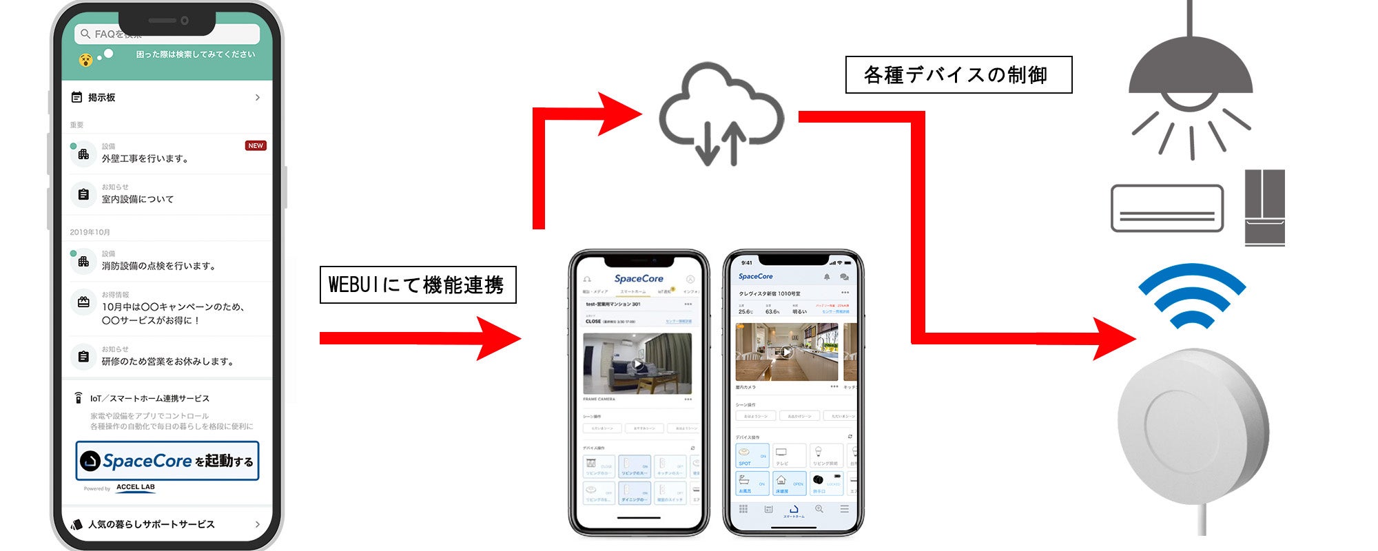 「SpaceCore(スペース・コア)」は、不動産会社やハウスメーカー等の住宅・不動産事業者(以下、事業者)と居住者・オーナーのためのスマートホームサービスです。2019年8月より提供を開始して以来、全国180※社以上、約18,000戸に導入されております。スマートホーム機器を設置し、専用アプリで家電製品や住宅設備が連動するオートメーション化や遠隔操作が可能になる「スマートホーム機能」、物件のオーナーや居住者との契約事や日々のコミュニケーションが円滑におこなえる「リレーション機能」、住んでいる地域に関するさまざまな生活サービスをユーザーが利用できる「生活サービス機能」を備えています。これらの機能を一元化し、事業者と居住者の双方が活用できるクラウドサービスおよびアプリとして提供しています。※2022年7月時点