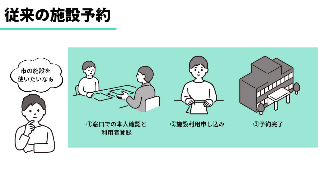 従来の自治体が利用する施設予約システムでは、オンライン利用登録に対応しておりませんでした。そのため住民は、初回利用時は窓口に行き、利用者登録を実施する必要がありました。