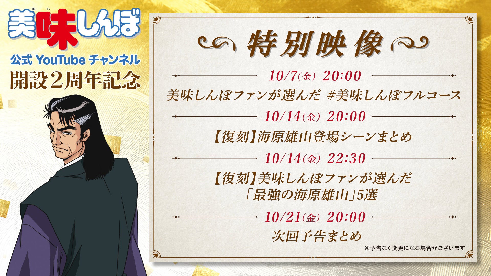 開設2周年を記念して、視聴者投票の結果よりエピソードをまとめた特別映像『#美味しんぼフルコース』や、過去に配信し好評だった人気キャラクター・海原雄山の特別映像を再配信する企画『復刻!海原雄山スペシャル』、YouTube初公開の『予告編まとめ映像』をお届けいたします。