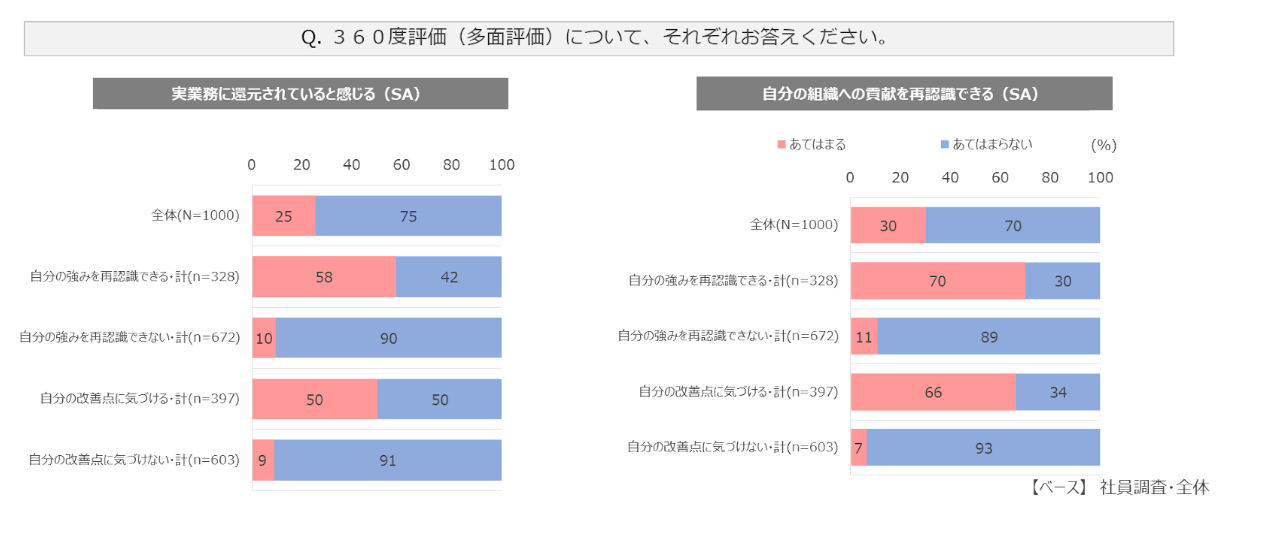 360度評価の意味や目的の伝達が不十分で回答者と対象者の不安軽減や取り組み姿勢のケアがないと、正当な評価が妨げられやすくなる傾向が明らかになりました。実施後の結果フィードバックや活用フォローで結果を受け止め、自身の強み・改善点を認識する機会を持てないと、その後の行動改善まで繋がりにくくなってしまうこともわかりました。