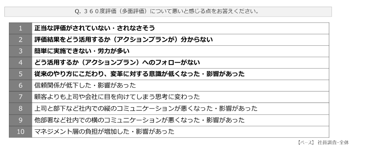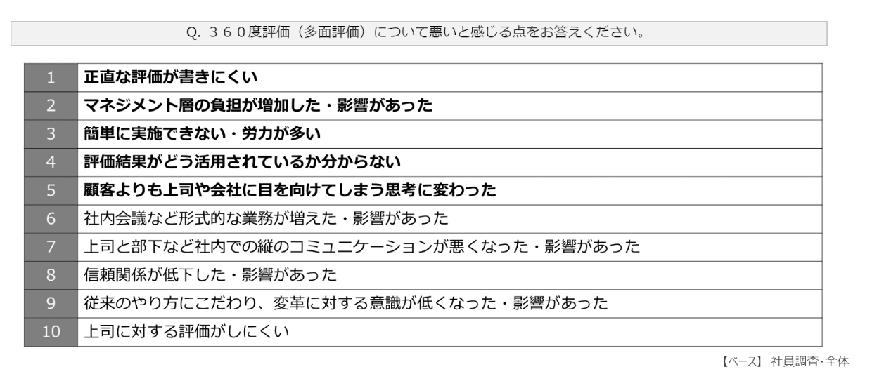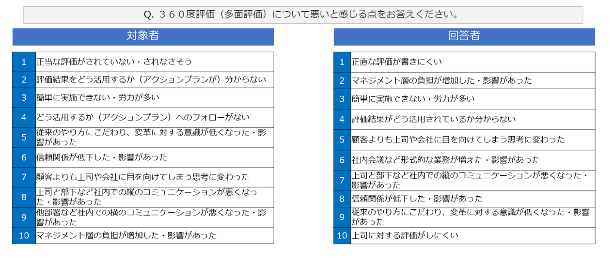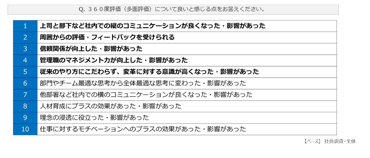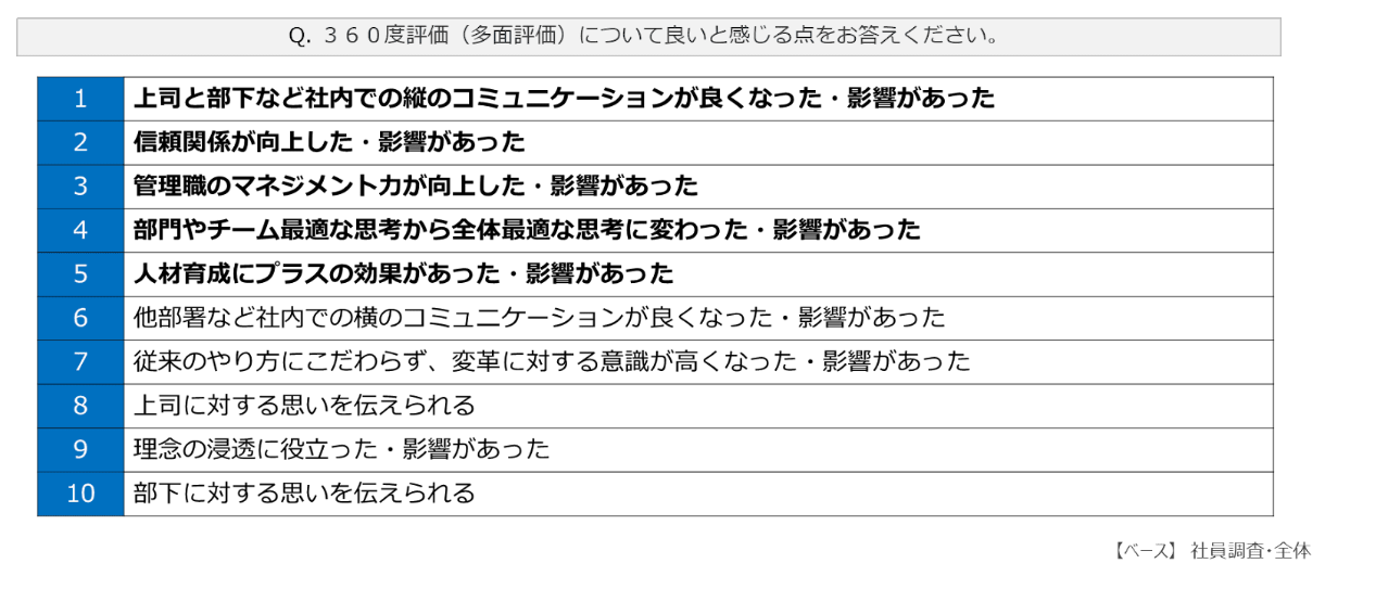 ■360度評価の対象者が良いと感じる点の上位5つは、「上司部下など縦のコミュニケーション向上」「周囲からの評価・フィードバックを受けられる」「信頼関係の向上」「マネジメント力の向上」「変革意識の向上」となった。