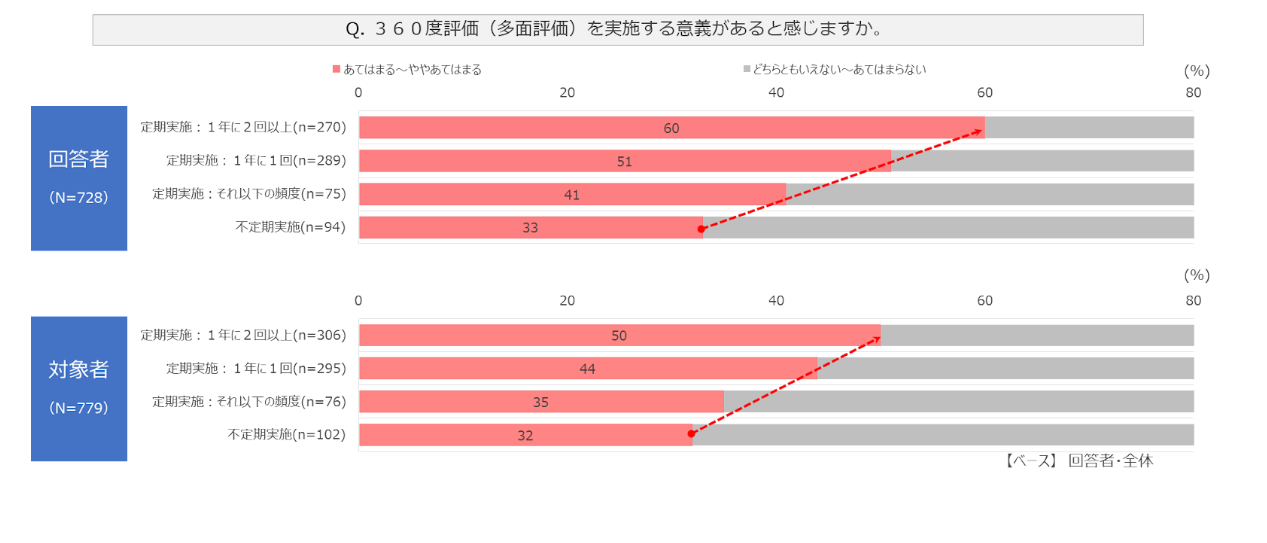 ■回答者、対象者ともに、実施頻度が高いほど360度の実施意義を感じている。また回答者に至っては、不定期実施と年2回以上では意義の実感に2倍近くの差がある。