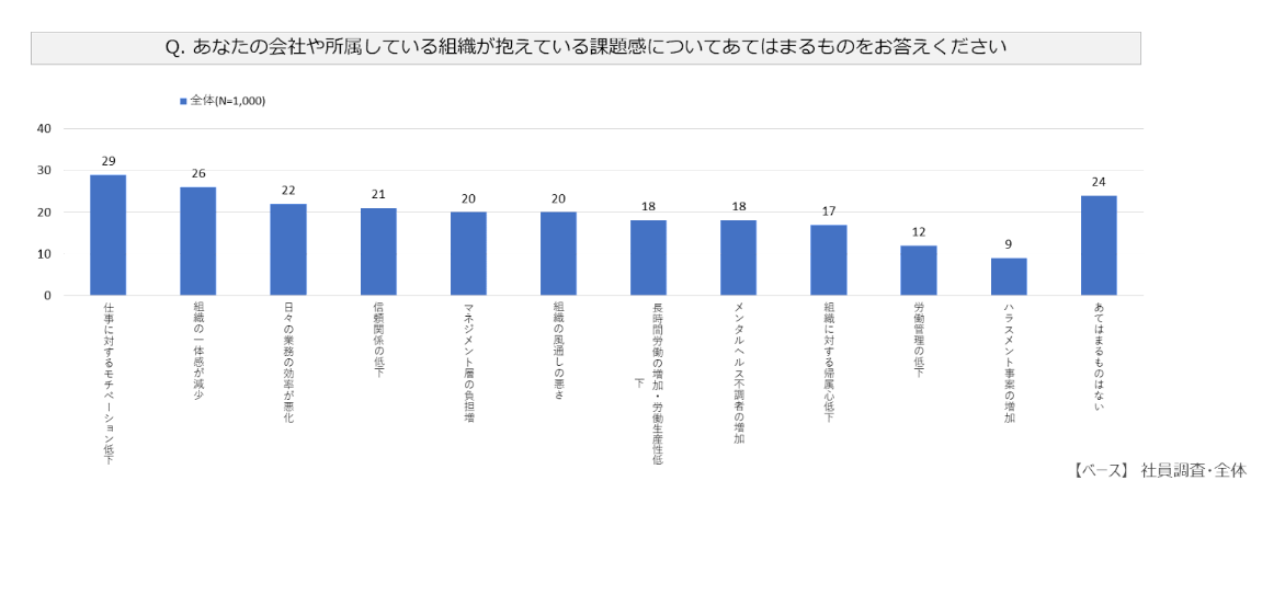 ■一方で、社員(回答者)が職場に感じる課題の上位は「仕事に対するモチベーション低下」「組織の一体感減少」「日々の業務効率悪化」「信頼関係の低下」「組織の風通しの悪さ」「マネジメントの負担増」となっている。コロナ禍でリモート化など働き方が変わる中での不安や戸惑いを受けて、記載の項目が上位になったとみられる。職場ではお互いの意思疎通や関係性の齟齬が発生し、環境変化対応でマネジメント層が苦戦し負担が増していることが推察される。