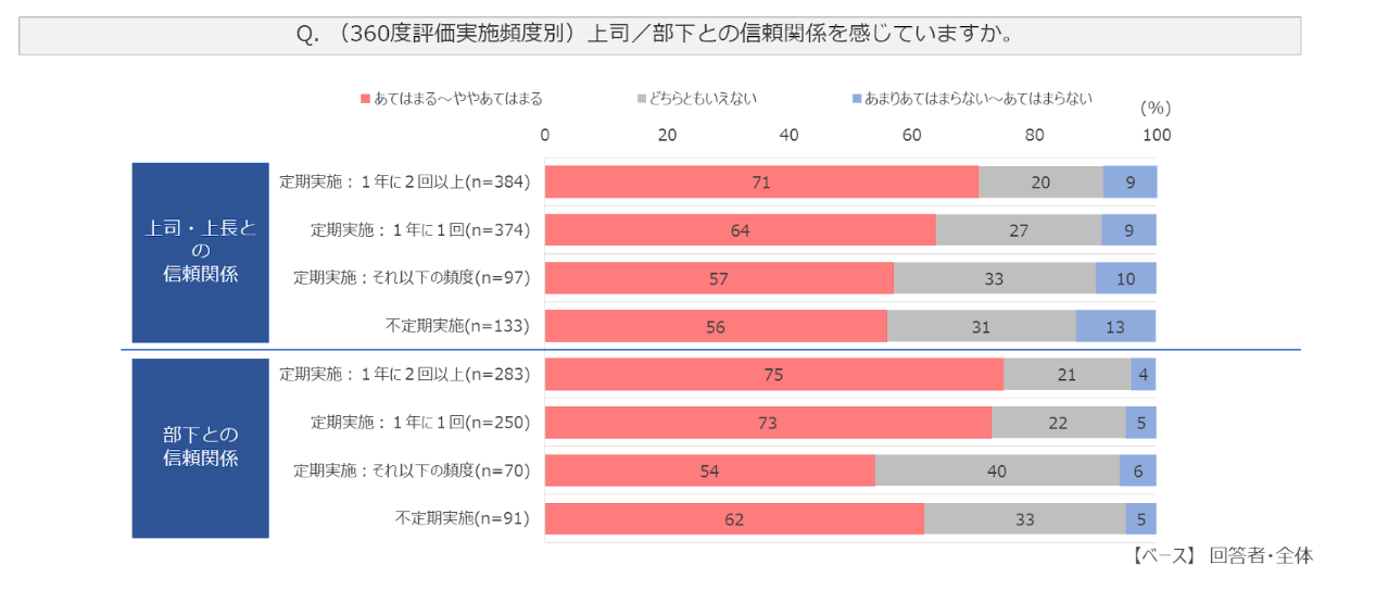 年1-2回実施の企業が約7割で、頻度を高めて取り組んでいきたい人事の意向が窺えます。より実施頻度の高い企業ほど結果のフィードバックがなされる割合も高くなるという傾向、個々人に適切なフィードバックがなされることによって上下の信頼関係も良好となり、実施意義実感も高まるという傾向がわかりました。