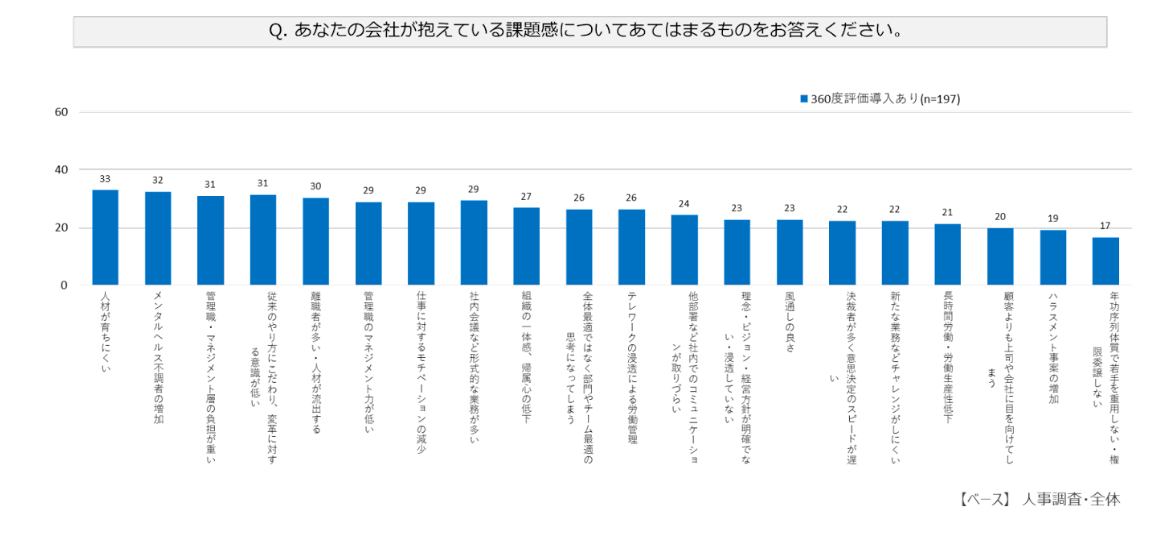 ■360度導入企業の人事が感じる会社の課題の上位には、「人材が育ちにくい」「管理職・マネジメントの負担が重い」「管理職のマネジメント力が低い」など管理職に強く関連するものが多い