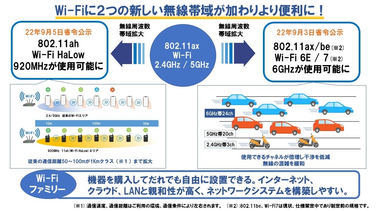 2022年9月に公布・告示された総務省の省令により、920MHz帯の周波数帯域を利用する「IEEE802.11ah」とともに、「IEEE802.11ax (Wi-Fi 6E)」や、規格化が進められている「IEEE802.11be(Wi-Fi 7)」において6GHz帯が利用できるようになり、国内におけるWi-Fi規格で利用可能な周波数帯域が拡大されました。