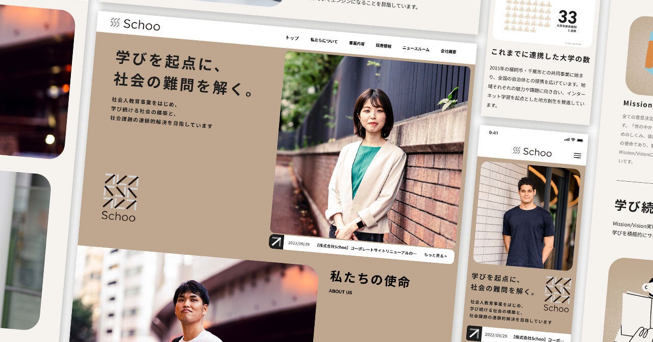 2022年10月、創業12年目を迎えるにあたり、「社会人向けオンライン学習の会社」というイメージにとどまらず、「インターネットによる学びや教育を起点とした社会変革を行う会社」として、株式会社Schooの現在とこの先を過不足なく説明するため、この度コーポレートサイトのリニューアルを行いました。