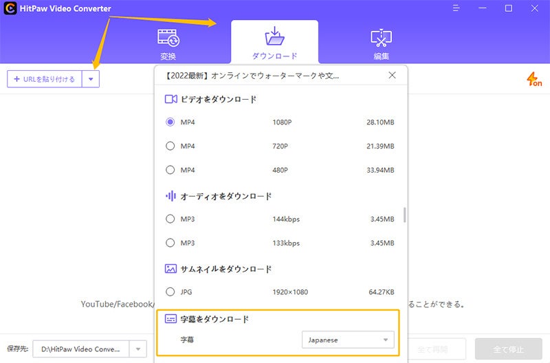 手順3:HitPaw video converterを起動し、「ダウンロード」>「URLを貼り付ける」オプションを選択してください。