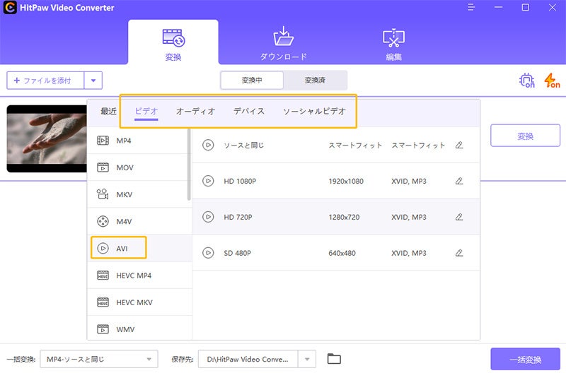 手順6:変換したい形式と解像度を選択し、「変換」をクリックします。これで、YouTubeから動画の保存及び保存した動画を任意な形式に変換できます。