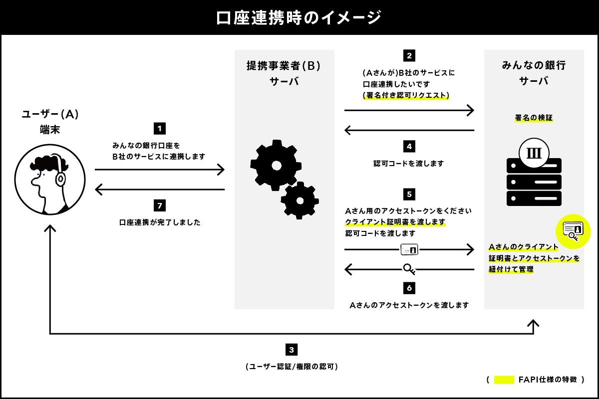 提携事業者とのAPI連携時の認可リクエストが安全な方法によって署名・検証され、みんなの銀行へアクセストークンの発行を要求(あるいは使用)する際に、mTLS(*5)によるクライアント証明書を要求し、アクセストークンとクライアント証明書を紐付けして検証されることで高いセキュリティを実現します。​