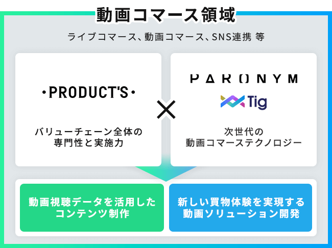 これにより、パロニムの動画コマーステクノロジーに加え、博報堂プロダクツやNTMの専門性と実施力を掛け合わせたサービスを提供することが可能になります。「Tig」独自の動画視聴データを活用したコンテンツ制作や、新しい買物体験を実現する動画ソリューションの開発などで、クライアントのECビジネスに貢献してまいります。