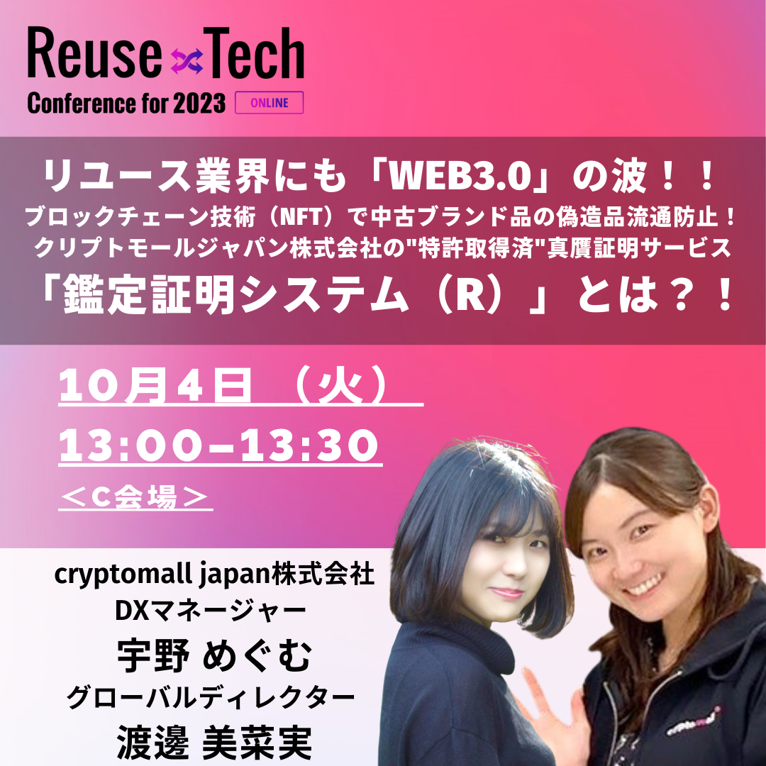 クリプトモールジャパン株式会社(本社:東京都港区、代表取締役:須江 剛 以下、弊社と言います)は、2022年10月4日(火)・5日(水) の2日間にわたりオンラインで開催される「Reuse × Tech Conference for 2023」へ出展することをお知らせいたします。