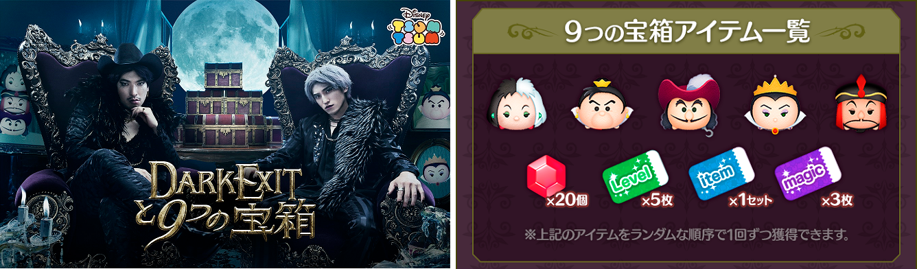 さらに、新WEB CM「DARK EXITと9つの宝箱篇」の公開を記念して、10月1日(土)より、EXITが登場するキャンペーン「DARK EXITと9つの宝箱」を開催するほか、「ディズニーヴィランズ」の特別な新ツム3種類が登場します。また、本キャンペーンをすべてクリアすると“DARK EXIT”の呪いが解け、本来の姿に戻ったEXITのゲーム内限定のスペシャル映像をご覧いただけます。