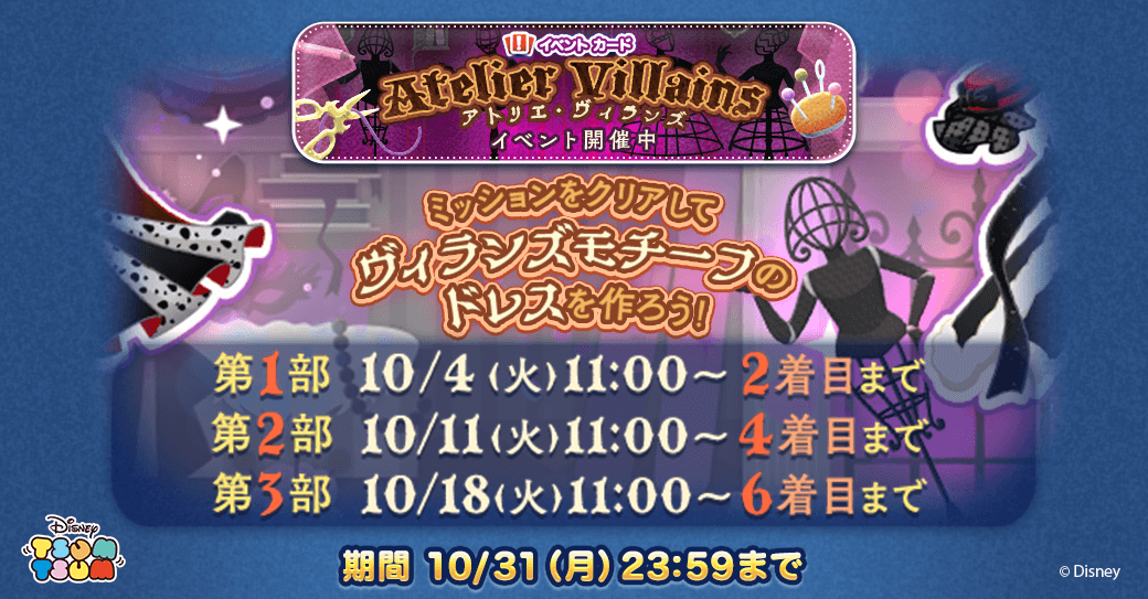10月4日(火)より、新イベント「Atelier Villains アトリエ・ヴィランズ」を開催いたします。このイベントは4つのミッションクリアごとにドレスのパーツが完成、5つのパーツを揃えてヴィランズモチーフのドレスを完成させるイベントです。また、このイベントには色合わせミッションとジュエル集めミッションというスペシャルミッションも登場するほか、今月の新ツムはすべてにキャラクターボーナスが発生し、ミッションをクリアしやすくなります。イベントをクリアするとチケットやピンズがもらえますので、お見逃しなく。
