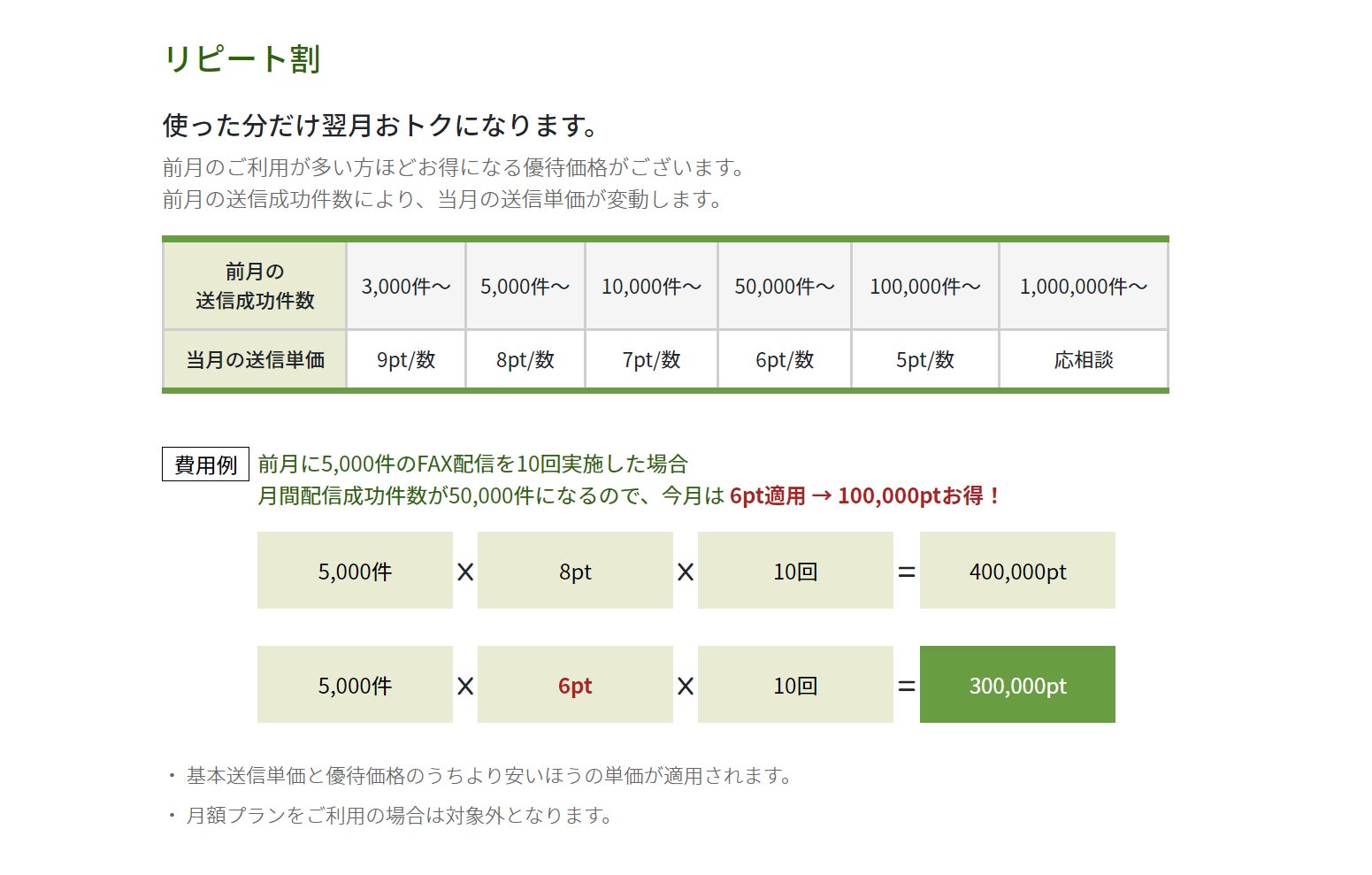 ・リピート割に関わらず、送信時の単価の最安値が適用されます。