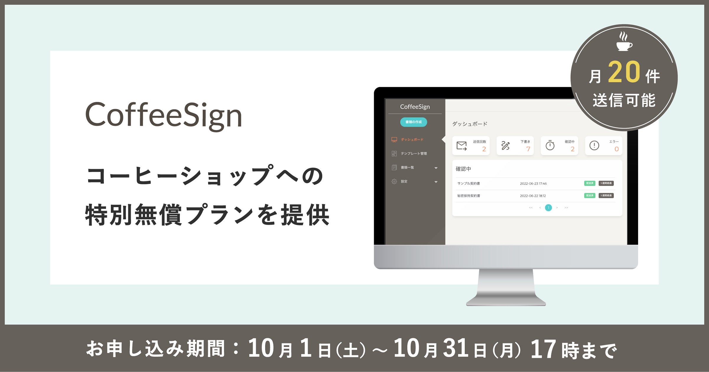 SDT株式会社(本社:神奈川県藤沢市 代表取締役:乾 泰行)は、10月1日のコーヒーの日にちなんで、コーヒーショップにご利用いただける電子契約サービス「CoffeeSign」特別プランのご提供をお知らせします。10月中にお申込みいただくことにより、CoffeeSignをずっと無料でご利用いただくことが可能となります。