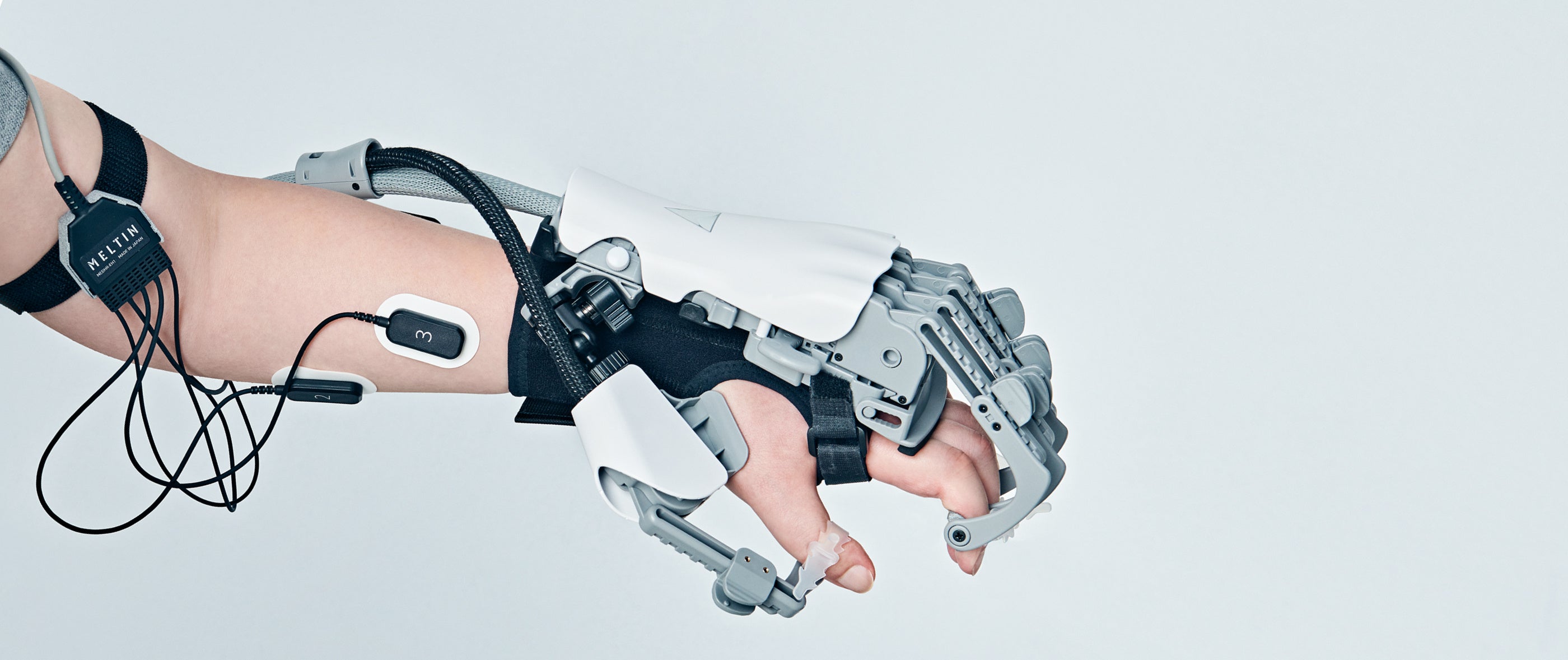 MELTz®は、「生体信号処理技術+生体模倣ロボット技術」を適用した医療機器であり、脳卒中などによる手指麻痺のリハビリテーションにおいて、上肢の筋力を維持、回復させることを使用目的としています。手指の運動意図を筋電(生体信号)から識別するアルゴリズムと、本人の運動意図に応じた運動のアシストを行うロボット装置の連動により、手指運動機能リハビリテーションを支援します。MELTz®は、以下の特徴を有しています。