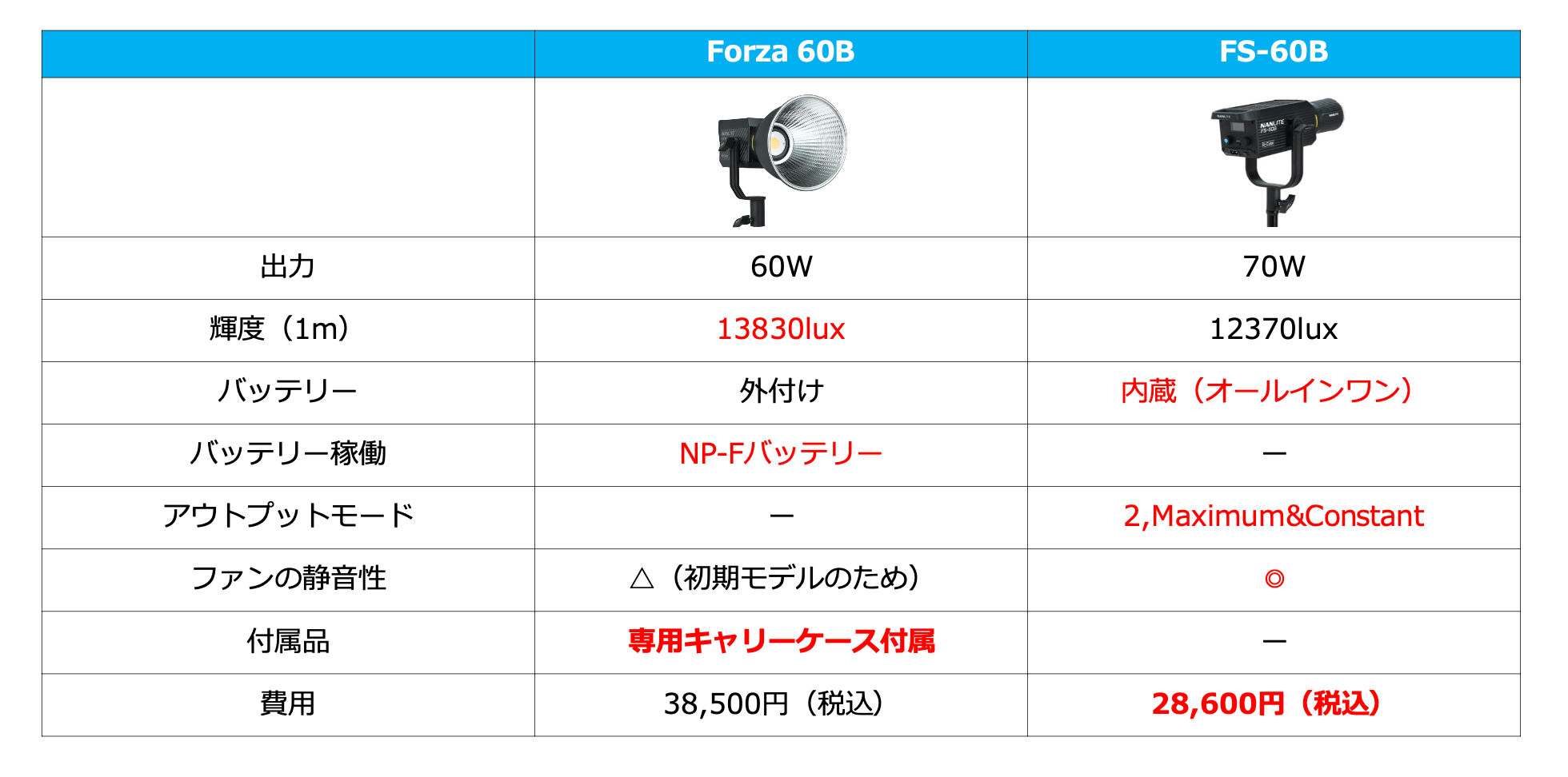 コンパクトな見た目で持ち運びが簡単だと大人気の「Forza 60B」との違いは、主に価格や照度、設計にあります。