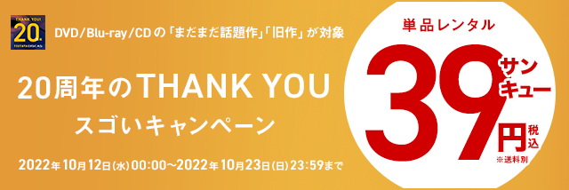 20周年の日頃の感謝をこめて、10月12日から10月23日まで単品レンタル1枚通常242円(税込・送料別)のところ、期間限定でDVD/Blu-ray/CD「まだまだ話題作」「旧作」を1枚39円(サンキュー)(税込・送料別)でご自宅に1枚からお届け致します。単品レンタルは無料会員プランでもご利用いただけます。